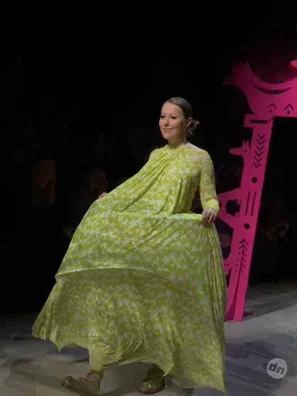 Собчак продефилировала на показе бренда Vereja в платье с растительным орнаментом и с пышной юбкой с кринолином. Однако подол наряда оказался слишком длинным, так что ведущей пришлось придерживать юбку за каркас.
