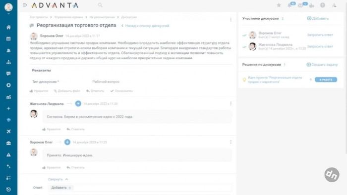 Обсуждение идей внутри единой системы управления инвестпроектами ADVANTA