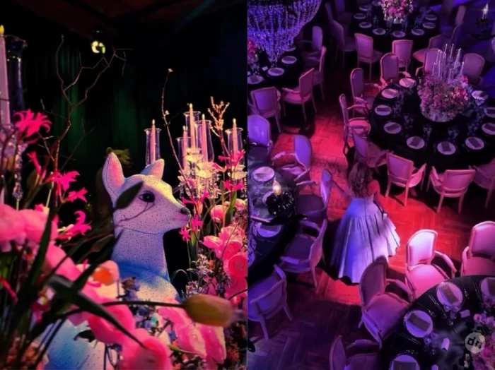 В минувшую субботу, 15 марта, Рудковская наконец-то собрала всех своих близких в особняке на Волхонке. В этом году Яна решила отметить день рождения в настоящем сказочном лесу. Гостей встречала тропинка, украшенная белыми цветами, пройдя которую, друзья продюсера попадали на поляну с животными — гигантскими фигурами зайца, олененка и тигра. Все они были полностью увешены стразами, которые отражали попадающий на них свет прожекторов. Сам особняк был украшен бесконечным множеством бело-розовых цветов и зелеными листьями.