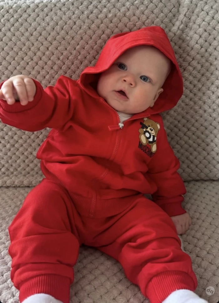 «Уже в подарочке гоняет. Ну что за сладуся!» — написала Ольга, опубликовав фото крестника в костюме от Moschino.