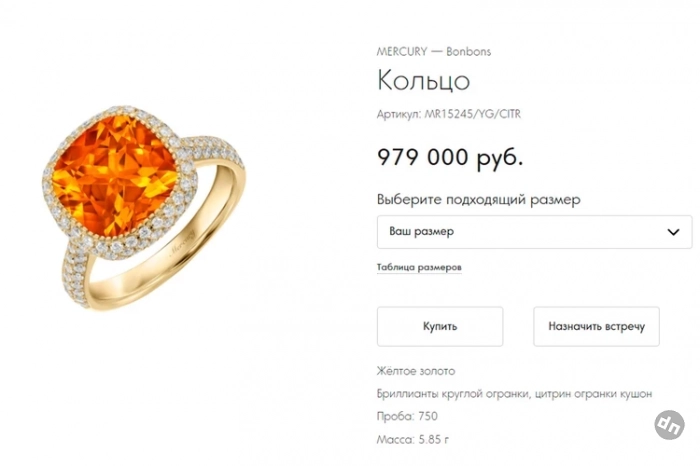 Оказалось, что ювелирное украшение из желтого золота, украшенного бриллиантами круглой огранки и цитрином, обошлось парню в 979 тысяч рублей.