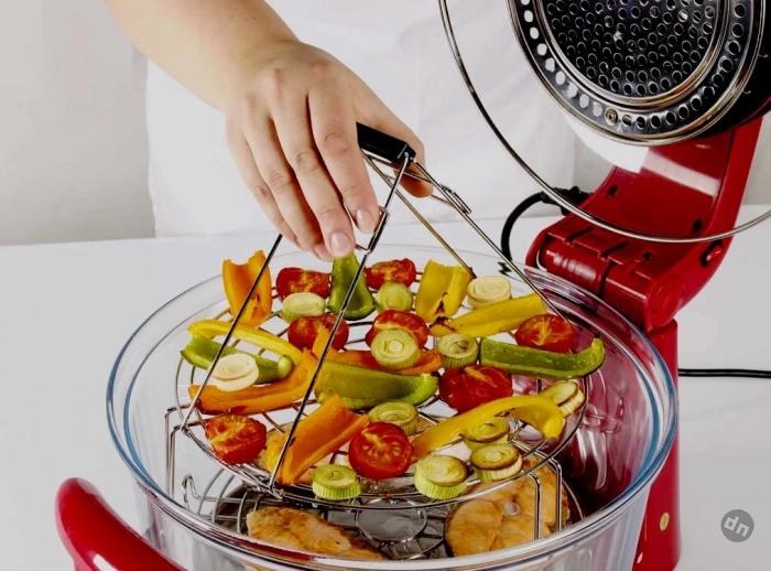 Аэрогриль обладает широким функционалом, позволяя готовить не только жареные блюда, но и тушить, варить, а также выпекать и коптить продукты. В нем можно готовить супы, каши и даже сушить фрукты или ягоды. Все эти процессы проходят без добавления масла, а лишняя жидкость стекает в специальную емкость, что делает блюда более диетическими.