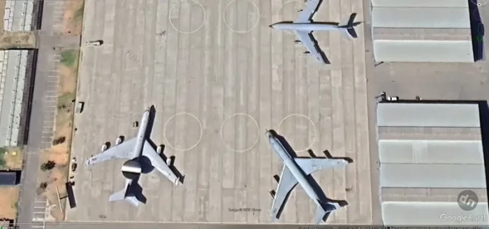 Спутниковый снимок Google Earth: чилийские самолёты ДРЛО E-3D и EB-707, а также заправщик КС-135 на авиабазе Нуэво Пудаэль