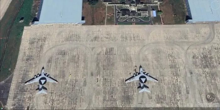 Спутниковый снимок Google Earth: разобранные самолёты E-2C на авиабазе Лас-Бахадас
