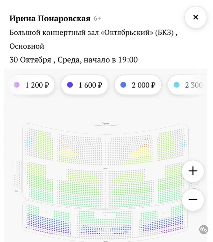 Старая схема продаж билетов на концерт Понаровской 30 октября, который был отменен. Данные продаж на 28.09 — непроданные места выделены цветным. Фото: скрин с сайта продаж.