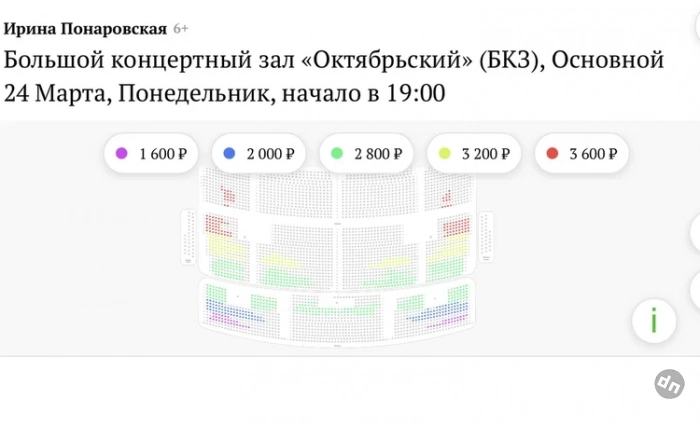Новая схема продаж билетов на концерт Понаровской 24 марта. Цветным отмечены не проданные места на 17 марта. Фото: скрин с сайта продаж