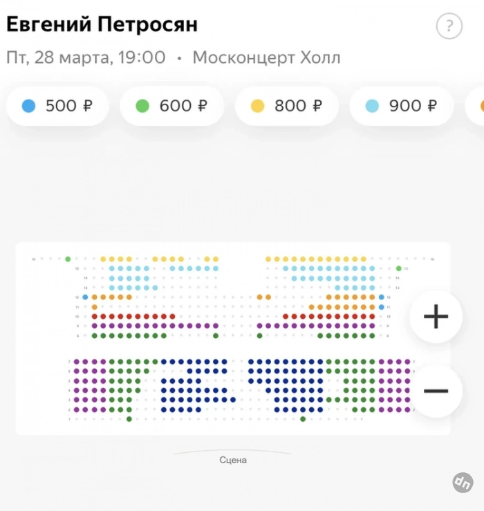 Схема продаж билетов на концерт Евгения Вагановича Петросяна 28 марта. По данным на 17 марта. Цветным отмечены не проданные места. Фото: скрин с сайта продаж