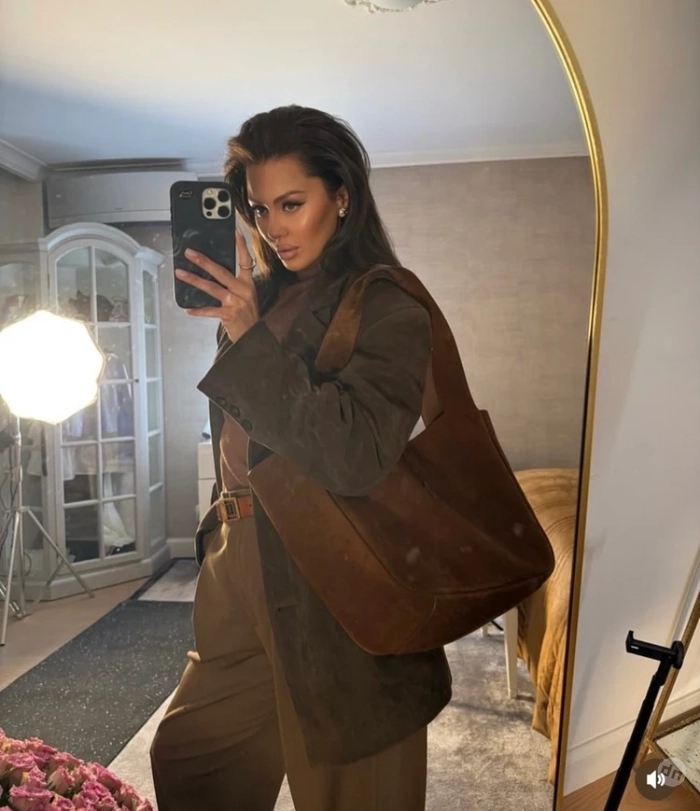 Как и Анфиса Чехова, Виктория собрала total brown look. Шоколадный жакет звезда сочетала со светло-коричневыми брюками и дополнила образ объемным замшевым шоппером от Saint Laurent (€ 2900 на официальном сайте). Сумка, разумеется, тоже дорогая, но надо отметить, что очень удобная и вместительная.