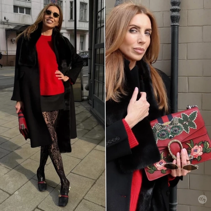Этой весной Светлана успела выгулять винтажную сумку от Gucci. Кажется, что такие кросс-боди были в моде примерно лет 10 назад, а может и больше. Итальянский бренд безошибочно можно определить по фирменной ленте, состоящей из трех полосок (она была позаимствована из конной амуниции). Такую же можно наблюдать и на лоферах Бондарчук, тоже от Gucci. В тон сумке, украшенной головой енота и цветами, журналистка подобрала алый джемпер, который дополнила миниюбкой, а сверху накинула накинула пальто с мехом.
