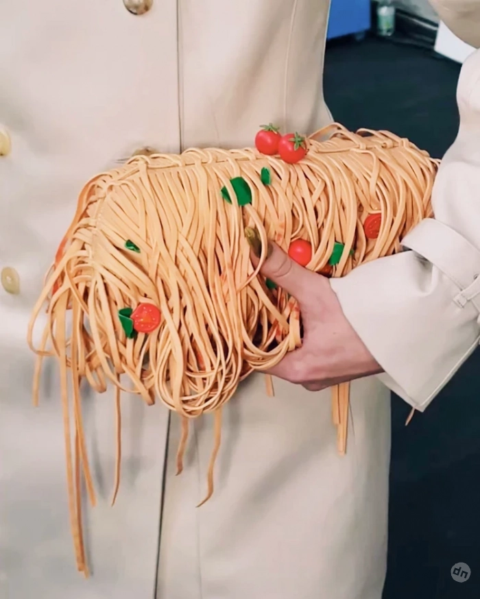 Moschino известен своей любовью к необычным формам. Так, на сайте итальянского бренда можно найти сумки в виде куска пиццы или дольки арбуз. А на недавнем показе дом моды анонсировал клатч из коллекции осень-2025 — он выполнен в виде… спагетти. Всем любительницам макарон посвящается.Клатч-спагетти