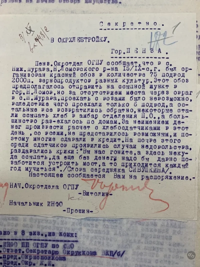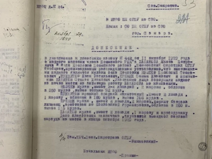 Документы истории. Сегодня мы продолжаем знакомиться с документами пензенского партийного архива, находящимися в папке с донесениями Пензенского окротдела ОГПУ с сентября 1929 и по март 1930 года. То есть это время самого начала коллективизации советской деревни. Из предыдущего материала, думается, каждому было понятно, с какими огромными трудностями столкнулась советская власть на пути установления колхозного строя в деревне, начиная от нехватки кадров и до нехватки материальной базы, нередко имеющейся, но почему-то ржавевшей под снегом.
