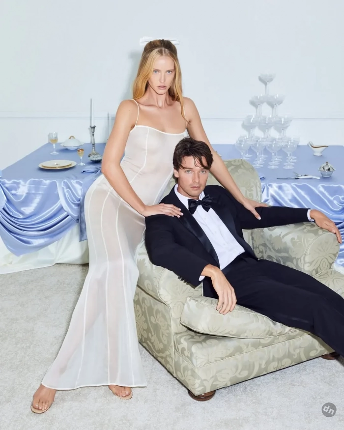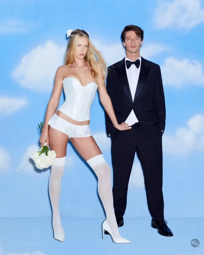 "Самая горячая пара сезона", как её представили в рекламе, предстала в кадре в роли жениха и невесты, продемонстрировав "свадебную коллекцию" с комплектами нижнего белья. В линейку также вошли корсеты, высокие чулки, прозрачное платье.
