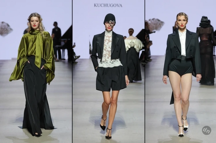 Для новой коллекции бренда Kuchugova «Маскарад» отправной точкой послужил исторический крой сразу 3-х эпох — дизайнер Анастасия Кучугова вдохновлялась началом XIX, XX и XXI веков. Особенностью коллекции стали элементы брутального стиля — свободные силуэты, акцент на плечи, двубортные костюмы, кашемировые брючные комплекты, а также микрошорты, которые присутствовали в каждом третьем показе. При этом в капсуле нашлось место и женственным образам: макси-платья с высоким разрезом, пышная юбка с акцентом на талии в сочетании с блузой жемчужного оттенка.