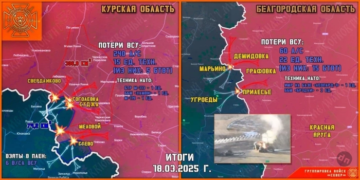 В свою очередь Telegram-канал "Северный ветер" уточняет, что 18 марта группировка войск "Север" уничтожала личный состав и технику противника, пытавшихся прорваться в Белгородскую область, и продолжила освобождение Суджанского приграничья.