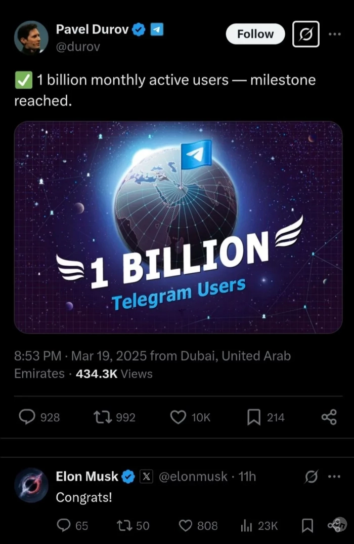 Павел Дуров, на которого завели уголовное дело во Франции из-за отказа Telegram сотрудничать с властями, сообщил, что количество пользователей его мессенджера достигло 1 млрд. Он также раскритиковал WhatsApp и получил комплимент от Илона Маска.