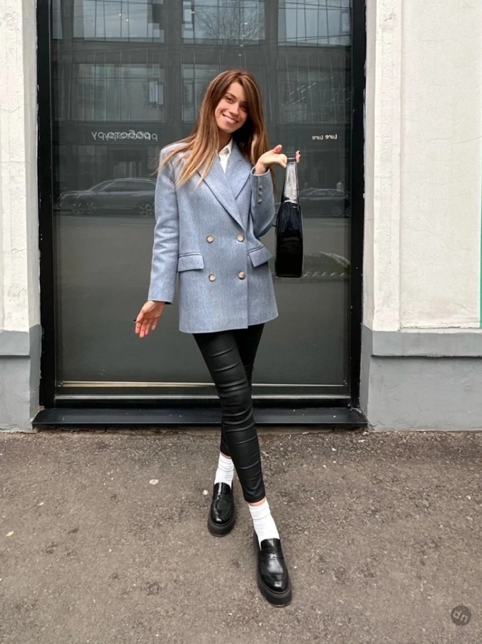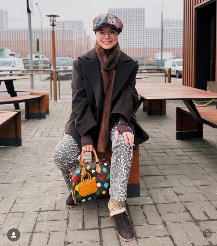 Молодая супруга Петросяна выгуляла укороченное пальто ультрамодного коричневого оттенка. Его она сочетала с леопардовыми джинсами и объемным норковым шарфом. А вот дальше что-то пошло не так. Сумка в горох от Louis Vuitton, меховые мюли в сочетании с носками Gucci и пестрый берет-гаврош. Слишком всего много, и все из разных опер. Я бы сняла нелепый «гаврош», заменила бы сумку, а вместе мюлей надела бы коричневые лоферы.