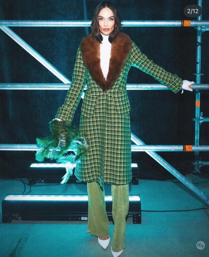 Алена собрала образ в актуальном стиле ретро. Разумеется, «гвоздь программы» — это клетчатое пальто с шикарным воротником из норки. По признанию самой Водонаевой, его она приобрела на Avito, а значит, это настоящий винтаж. Пальто Алена сочетала с белой водолазкой, зелеными джинсами из велюра и светлыми лодочками. А в качестве акцента блогер использовала эксцентричный клатч с перьями. И отправилась так на Московскую неделю моды. Мне образ очень нравится.