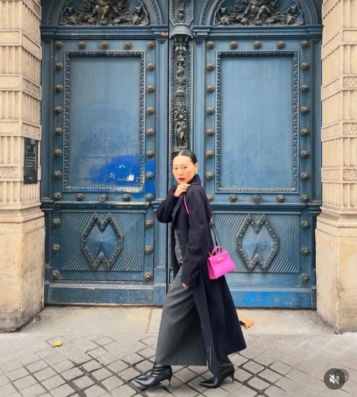 Певица и актриса демонстрирует темно-синее пальто актуальной длины макси, которое сочетает с эффектным длинным платьем и сапогами на шпильке. Мне нравятся акценты, которыми Ян Гэ эффектно разбавляет строгий образ — розовая сумка Hermes и неоново-зеленые сережки. Кстати, вот идея — как носить очень яркие аксессуары. Комбинируйте их с вещами нейтральных оттенков.