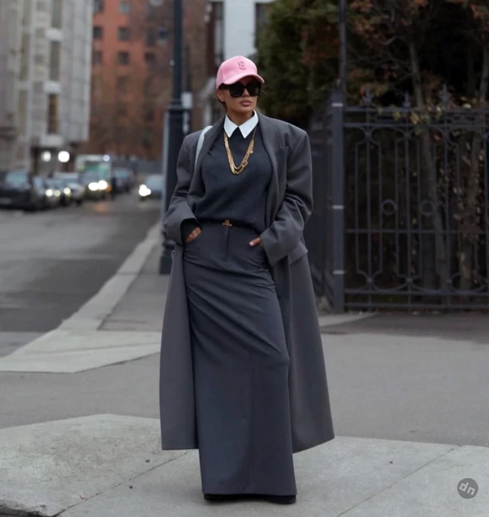 В образе Виктории все «макси». Пальто макси, юбка макси. Плюс джемпер в сочетании с белой рубашкой, застегнутой на все пуговицы. А сверху еще розовая бейсболка. Ощущение какой-то закупоренности. Хотя для Бони, которая, наоборот, любит раздеваться, это даже как-то нетипично. Я понимаю, что она хотела прорекламировать кепки своего бренда, но уж очень хочется снять неуместный головной убор, распустить волосы и добавить образу легкости.