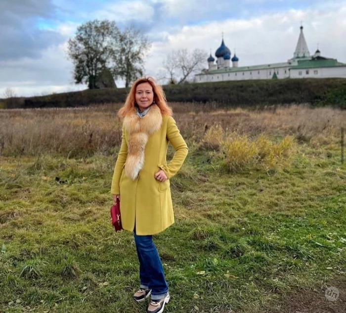 Желтый цвет Елене, безусловно, идет. Но все остальное в этом образе нужно менять. Лисий воротник можно оставить, но само пальто сделать объемнее. Модели в облипку были в моде лет 15 назад. Да и джинсы уже давно никто не подворачивает. Впрочем, как и не носит такие кроссовки. Хотя нет, их можно надевать, но куда-нибудь в поход.