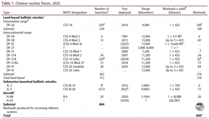 Таблица 1. Ядерные силы Китая, 2025 г.