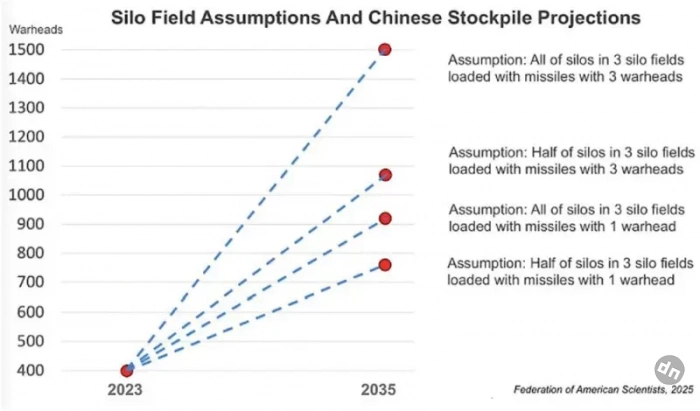 Резкое увеличение количества пусковых установок за два года говорит о том, что Министерство обороны США теперь учитывает все новые шахты Китая в своей оценке пусковых установок МБР. Однако, вероятно, многие из этих новых ШПУ все еще не загружены ракетами; разница между 500 пусковыми установками и 400 ракетами указывает на то, что Китай, возможно, все еще производит ракеты для новых пусковых установок. Анализ спутниковых снимков показывает, что строительство продолжается во всех трех шахтных полях, что позволяет предположить, что им может потребоваться еще несколько лет для достижения полной эксплуатационной готовности.