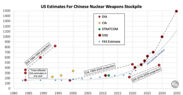 Оценка текущих прогнозов США относительно будущего размера ядерного арсенала Китая должна учитывать более ранние прогнозы, некоторые из которых не сбылись. В 1980-х и 1990-х годах правительственные агентства США опубликовали несколько прогнозов относительно количества китайских ядерных боеголовок.