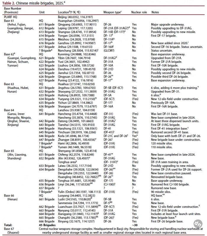 Таблица 2. Китайские ракетные бригады, 2025 г.