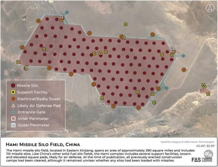 Рисунок 3. Спутниковые снимки, показывающие расположение ракетных шахт (красные круги), ворот безопасности и вспомогательных объектов (желтые квадраты), а также вышек наблюдения (оранжевые круги) на полигоне Хами в Синьцзяне, Китай. (Изображения: Maxar Technologies и Google Earth; Аннотации: Федерация американских ученых).