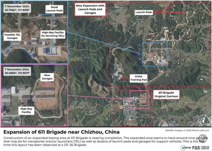 Рисунок 4. Расширение 611-й бригады около Чичжоу, Китай. 611-я бригада претерпевает значительное расширение в рамках включения баллистической ракеты средней дальности DF-26. Это включает уникальный гарнизон в форме круга, не встречающийся в других бригадах PLARF.