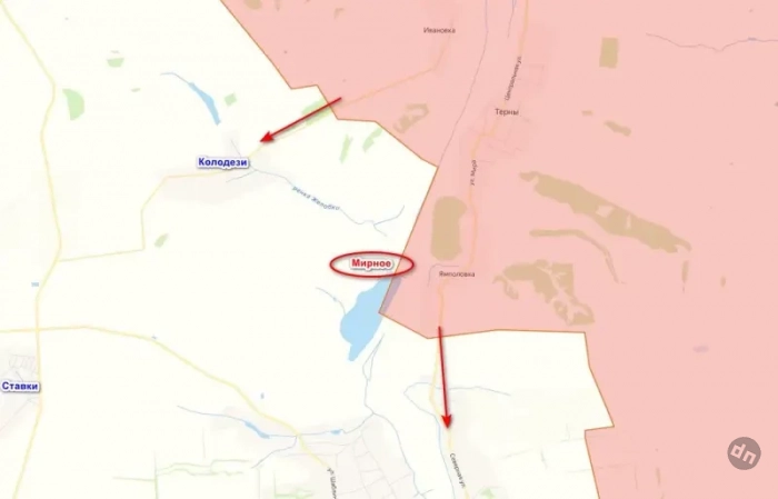Село Мирное относится к Краматорскому району ДНР и расположено к западу от Ямполовки. Ранее об освобождении этого населенного пункта не сообщалось, так же как и о ведущихся за него боях. До этого была информация, что штурмовики «Западной» группировки начали наступление на Торское, а также продолжают бои в направлении села Колодези. Так что упоминание о Мирном первое и сразу же от Минобороны, это может говорить о том, что наши уже продвинулись гораздо дальше.