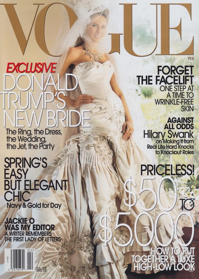 Мелания Трамп в 2005 году для VogueК слову, в январе этого года, в честь 20-й годовщины их свадьбы, Трамп опубликовал в инстаграме* архивное фото с торжества, на котором Мелания запечатлена именно в этом платье.