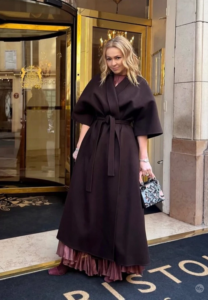 Яна не изменяет себе и стабильно выбирает длину макси. Коричневое пальто-кимоно продюсер сочетает с летящим платьем бордового оттенка. Плюс такого же цвета ботильоны. Продюсер разбавляет образ с помощью акцента — легендарной сумки Lady Dior (одна из любимых моделей Яны).