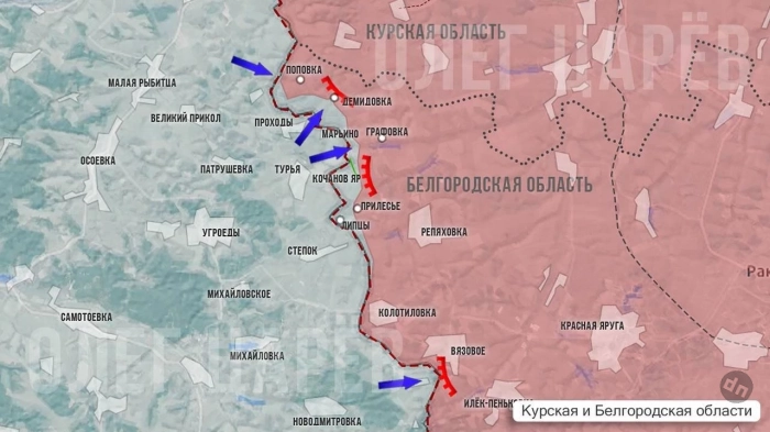 Также пришло известие об окончании зачистки Гоголевки и выходе наших к границе и на этом участке. Таким образом, под контролем ВСУ остаются только небольшой участок у Олешни, на подступах к которой тоже идут бои, и заминированные лесистые участки у Гуево и хутора Горналь.