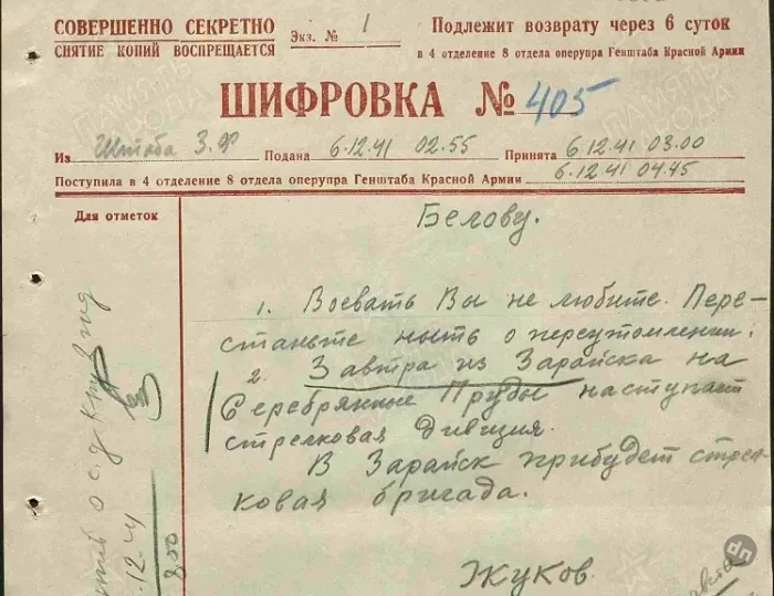 Шифровка Жукова, направленная командиру 1 гв.кк П.А. Белову