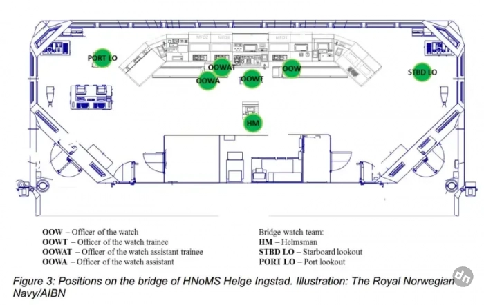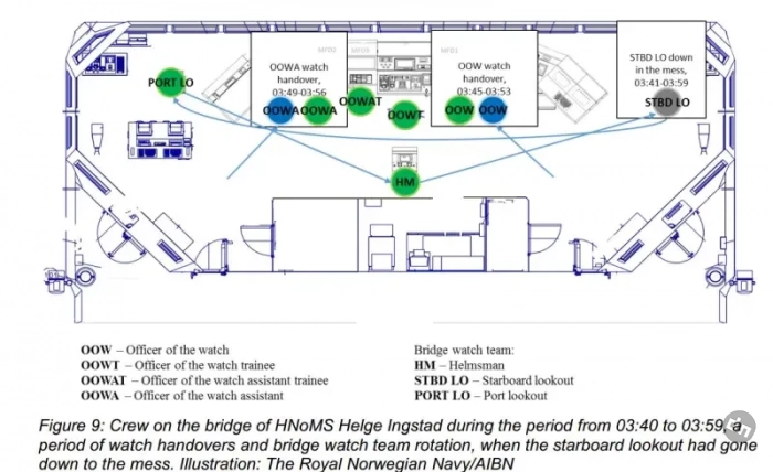 На мостике находилось 7 человек. Вахтенный офицер (OOW), как и положено, за всё отвечал и всё контролировал, а кроме него, было еще три офицера: дублер вахтенного офицера (OOWT), помощник вахтенного офицера (OOWA), дублер помощника (OOWAT). Трое рядовых моряков выполняли функции впередсмотрящих и рулевого, периодически подменяя друг друга. Дублеры офицеров занимались определением положения судна, используя электронные карты (ECDIS) и оптические средства. Местного лоцмана на фрегате не было.