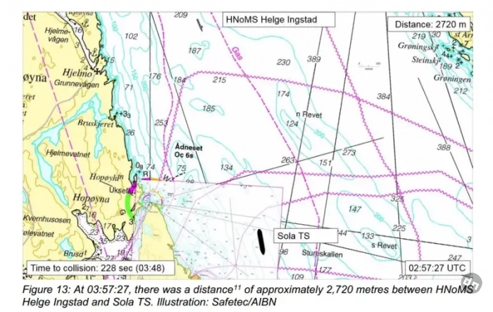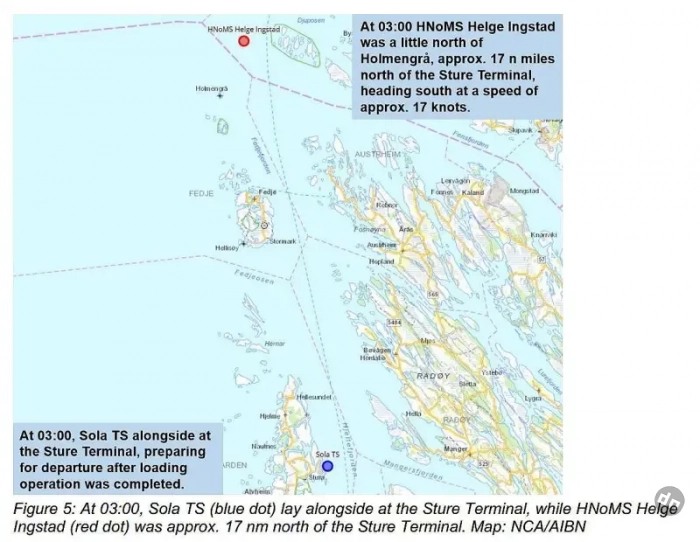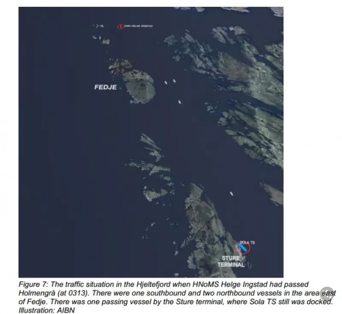 Оператор центра спустя некоторое время после запроса лоцмана с танкера вспомнил, что примерно в полтретьего военный корабль извещал центр о входе в его зону действия. Он немедленно связался с лоцманом по УКВ и в 03:59:46 сообщил тому, что, по всей вероятности, приближающееся судно — военный корабль Helge Ingstad.