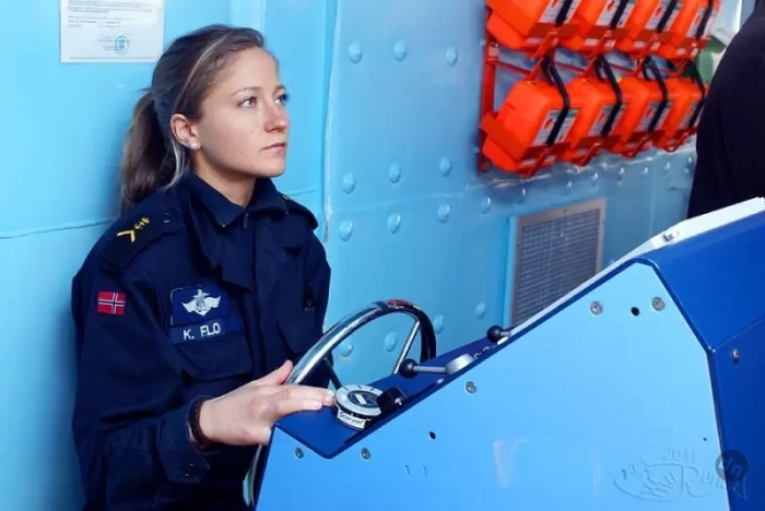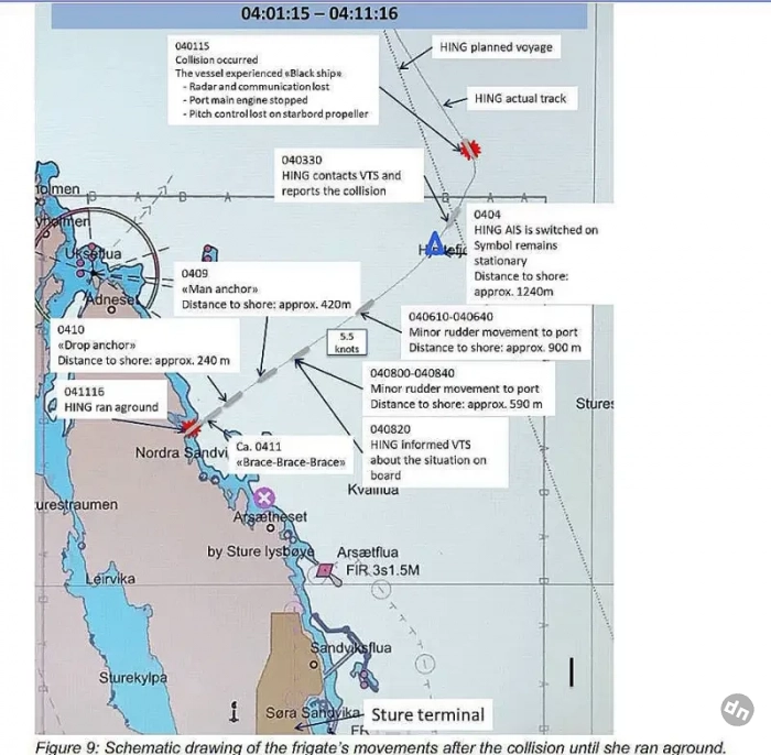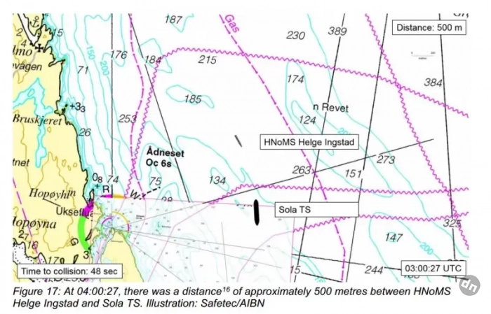 В 03:53 фрегат двигался курсом 158 со скоростью 17 узлов, обогнав яхту, также следовавшую на южный выход из фьорда. Вахтенный офицер уделил внимание трем судам, приближающимся с носовых углов по левому борту, и определил, что их курс слегка изменился к востоку. Это увеличило момент CPA (closest point of approach). Офицер громко объявил об этом всем на мостике и приказал докладывать об изменениях в движении этих целей. Названия приближающихся судов он не определял.