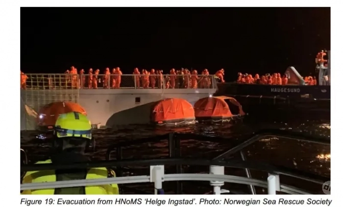 Буксир ‘Velox’ сообщил, что он может забрать всех, и что экипаж фрегата может перейти к нему на борт с вертолетной палубы. Эвакуация прошла без происшествия, и к 05:28 почти весь экипаж покинул корабль. Остались десять человек на мостике фрегата, пять человек дежурили на катере Sjøbjørn.
