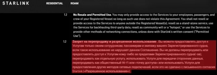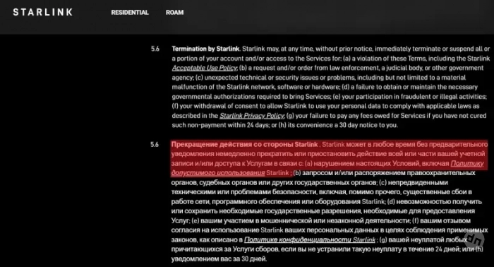 А на указанном сайте у нас есть раздел Условия обслуживания Starlink, пункт 5.6 которого говорит о том, что:
