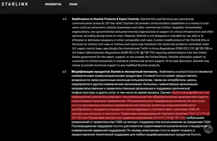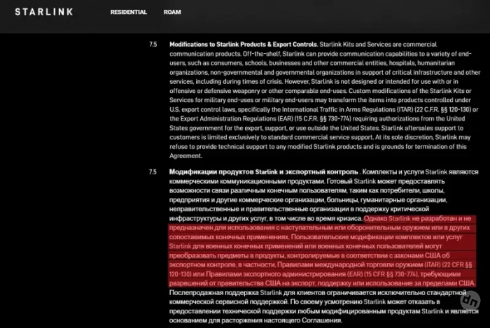 По сути, указанные пункты обязывают пользователя согласовывать с правительством США любое использование оборудования Starlink в составе каких-либо изделий, используемых как оружие.