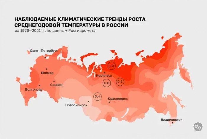 «В настоящее время деформировано почти 60 процентов объектов в Игарке, Диксоне, Хатанге, 100 процентов в посёлках Таймырского АО, 22 процента в Тикси, 55 процентов в Дудинке, 50 процентов в Певеке и Амдерме, около 40 процентов в Воркуте, около 300 сооружений в районе Норильска».