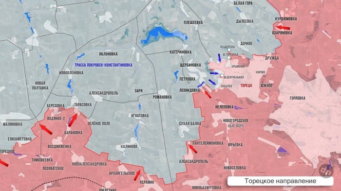 В Торецкой агломерации ВС РФ развивает успех юго-западнее города. После освобождения Пантелеймоновки и Александрополя, штурмовики вышли к окраинам Валентиновки. Продолжаются боевые действия в Щербиновке. Тактические успехи есть к северу от Торецка в районе Дружбы.