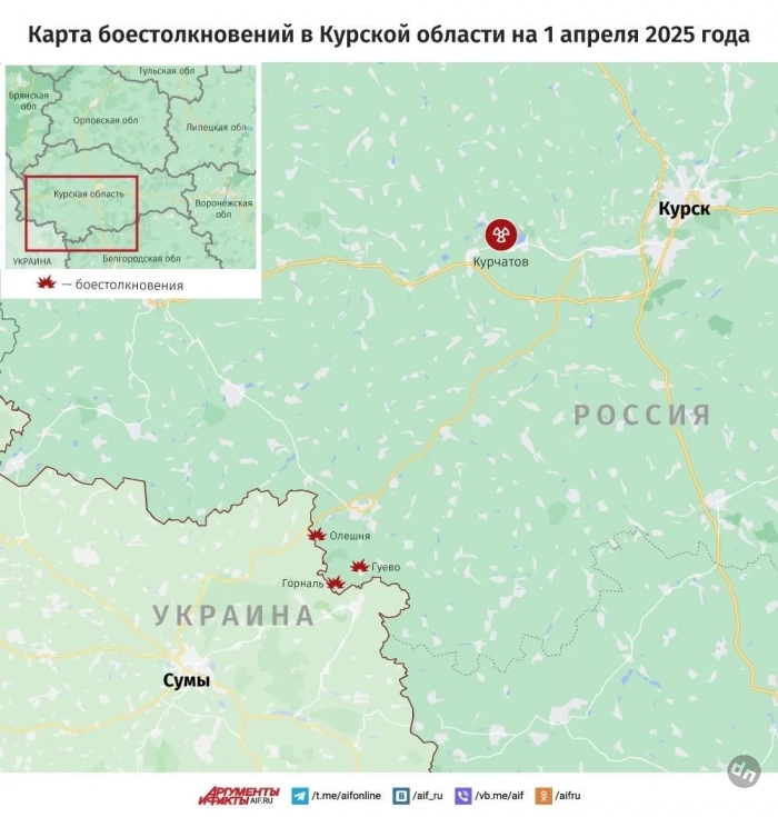 ВС РФ ведут мощные штурмы в районе Олешни в Курской области: карта боевых действий по состоянию на 1 апреля 2025 года