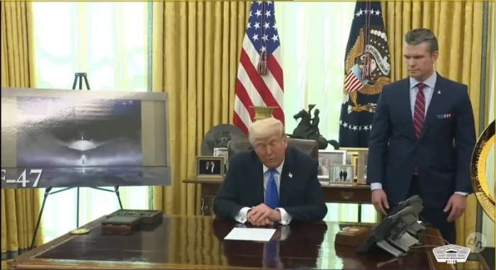 Скриншот прямой трансляции, на которой объявляется о победе в конкурсе по программе NGAD компании Boeing, с первым изображением F-47 рядом с президентом Трампом.