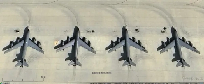 Спутниковый снимок Gооglе Еarth: бомбардировщики В-2А и военно-транспортный С-17А на стоянке авиабазы Фэрфорд
