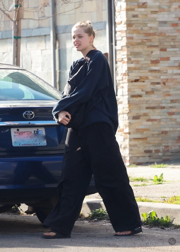 Шайло была облачена в объёмный темно-синий свитшот и широкие чёрные брюки, свои светлые волосы она убрала в высокий пучок (напомним, некоторое время Шайло носила короткую стрижку). Из аксессуаров у дочери Джоли замечены золотое кольцо на большом пальце и крупные серьги-кольца.