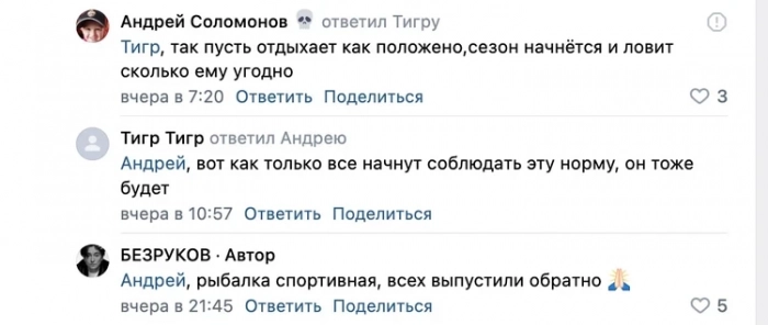 В комментариях у себя на страничке в ВК, куда поздно вечером 2 апреля все же пришел Сергей, он ответил, что «всех [рыб] выпустили обратно».
