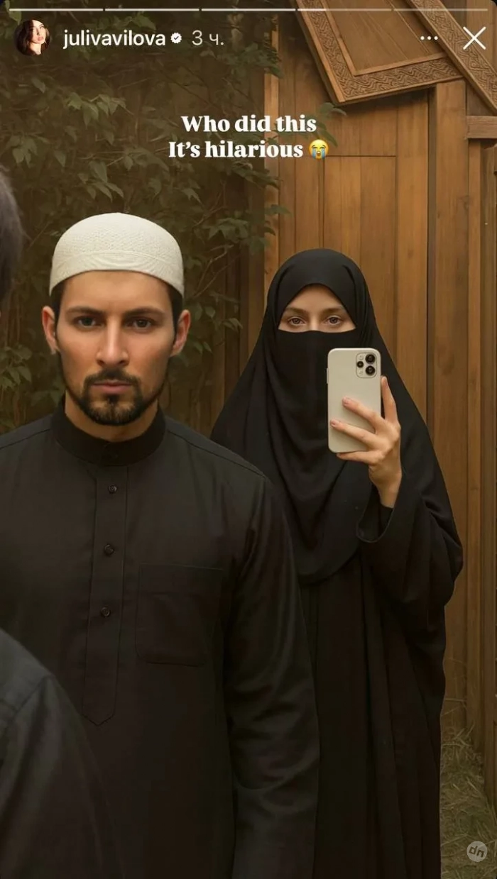 Кто-то из пользователей обработал кадр с помощью нейросети, "одев" пару в национальную одежду ОАЭ: Дуров предстал в чёрном камисе и с гафией на голове, а Вавилова — в парандже. Блогерша оценила снимок, опубликовав его в своих сторис*. "Кто сделал это? Очень смешно", — написала она.
