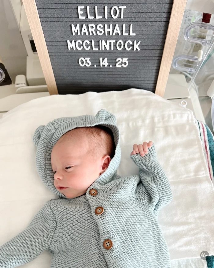 Судя по надписи на табличке, которую видно на фото, малыш родился 14 марта. Кроме того, там же указано, что мальчика назвали в честь знаменитого дедушки — Эллиот Маршалл.